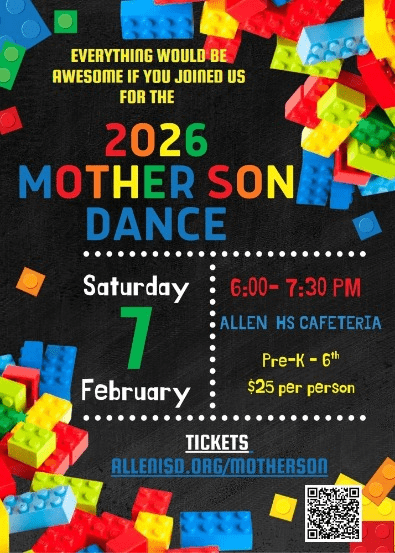 Welcome to Allen ISD Community Services Online Registration System WELCOME TO THE 2026 MOTHER–SON DANCE! Let’s Build Memories Together—One Brick at a Time! We’re so excited to snap into action with you and your little builder for a night that’s sure to be AWESOME (because everything is awesome when we're together)!Get ready for an evening stacked with fun, laughter, and unforgettable moments. Expect bright and colorful LEGO décor, music that’ll get you moving, professional photos to capture your picture-perfect creations, and light refreshments to keep your builder energy fully charged.Come dressed in your favorite LEGO-inspired outfit, your coolest builder gear, or your favorite dance attire—whatever makes you and your son feel like the ultimate build team ready to snap together for an amazing night!Registration is limited and offered on a first-come, first-served basis. Cancellations will be accepted with refunds issued if received before noon on Thursday, February 5, 2026. Registration closes at noon on Friday, February 6th. After that, tickets can be purchased at the door. Each person attending must buy a ticket.Checking in is easy—no tickets needed! Just give your name when you arrive. We’ll email a reminder and picture order form before the dance.5804 Photography will once again be capturing all the AWESOME moments. You can pre-order your portraits and pay online at 5804 Photography.If you have any questions or need more information, feel free to reach out at 972-727-0502.We can’t wait to see you there for a brick-tastic, memory-making, everything-is-awesome kind of night! REGISTER HERE __________________________________________________________________________________________________________ Kids Club Kids Club is an after-school program designed to provide children of working parents with a safe, home-like atmosphere. The program provides after-school care for children in kindergarten through grade six. Kids Club members are able to choose from a variety of recreational, social and enrichment activities each day. Start Exploring ______________________________________________________________________________________________________________ Learn 'N Playday Learn 'N Playday has been teaching 3-4 year old children in the Allen community since 1986. The Learn 'N Playday program is open to children who are 3 or 4 years old, by September 1 and reside in the Allen school district. We offer a tuition-based program from 9am-2pm, with two, three and five day a week options. Start Exploring Get in TouchIf you have any questions about programs we offer feel free to contact us. Contact Us